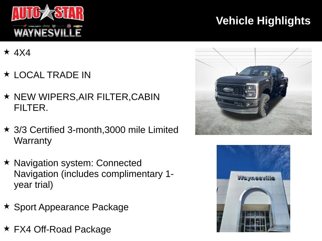 4X4, LOCAL TRADE IN, NEW WIPERS,AIR FILTER,CABIN FILTER., 3/3 Certified 3-month,3000 mile Limited Warranty, Black Tow Hooks, Body-Color Front & Rear Bumpers, Chrome Exhaust Tip, Dark Painted Grille, F-250 >10K GVWR Package, FX4 Off-Road Package, Hill Descent Control, Navigation system: Connected Navigation (includes complimentary 1-year trial), Off-Road Specifically Tuned Shock Absorbers, Order Code 608A, Platform Running Boards, Sport 4x4 Box Side Decal, Sport Appearance Package, Unique FX4 Off-Road Box Decal, Wheels: 20" Dark Carbonized Gray Painted Aluminum.
