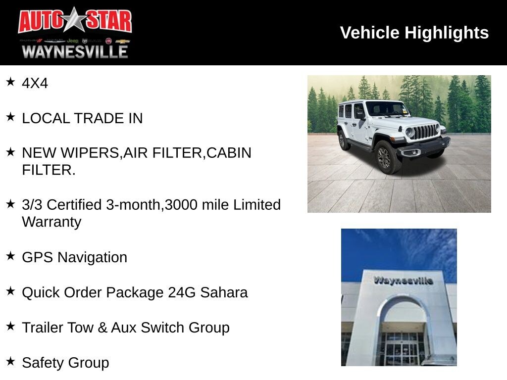 Check out all these great options Quick Order Package 24G Sahara, Safety Group (Auto High Beam Headlamp Control, Blind Spot & Cross Path Detection, and ParkSense Rear Park Assist System), Technology Group (12.3" Touchscreen Display, 4G LTE Wi-Fi Hot Spot, Apple CarPlay, Auto-Dimming Rear-View Mirror, Connected Travel & Traffic Services, Connectivity - US/Canada, Google Android Auto, GPS Navigation, HD Radio, Integrated Off-Road Camera, Integrated Voice Command w/Bluetooth, Radio: Uconnect 5 Nav w/12.3" Display, SiriusXM Radio Service, SiriusXM w/360L, and Universal Garage Door Opener), Trailer Tow & Aux Switch Group (7 & 4 Pin Wiring Harness, Auxiliary Switches, and Class II Receiver Hitch), 110 MPH Vehicle Max Speed Calibration, 3.45 Overall Top Gear Ratio, 4-Wheel Disc Brakes, 8 Speakers, ABS brakes, Air Conditioning, Alloy wheels, Alpine Premium Audio System, AM/FM radio: SiriusXM, Apple CarPlay/Android Auto, Automatic temperature control, Aux Battery, Brake assist, Cloth Low-Back Bucket Seats, Compass, Delay-off headlights, Driver door bin, Driver vanity mirror, Dual front impact airbags, Dual front side impact airbags, Electronic Stability Control, Emergency communication system: Jeep Connect, Front anti-roll bar, Front Bucket Seats, Front Center Armrest w/Storage, Front dual zone A/C, Front fog lights, Front License Plate Bracket (DISC), Front reading lights, Fully automatic headlights, Heated door mirrors, Heated front seats, Heated steering wheel, Heavy Duty Suspension w/Gas Shocks, Illuminated entry, Integrated Center Stack Radio, Integrated roll-over protection, Low tire pressure warning, MOPAR All-Weather Floor Mats, Non-Lock Fuel Cap w/o Discriminator, Occupant sensing airbag, Outside temperature display, Overhead airbag, Panic alarm, ParkView Rear Back-Up Camera, Passenger door bin, Passenger vanity mirror, Power door mirrors, Power steering, Power Top Quarter Window Storage Bag, Power windows, Radio data system, Radio: Uconnect 5 w/12.3" Display, Rear anti-roll bar, Rear reading lights, Rear Window Defroster, Rear Window Wiper/Washer, Remote keyless entry, Removable Rear Quarter Windows, Security system, Sky 1-Touch Power Top, Speed control, Split folding rear seat, Steering wheel mounted audio controls, Stop-Start Dual Battery System, Tachometer, Telescoping steering wheel, Tilt steering wheel, Traction control, Trip computer, Variably intermittent wipers, Voltmeter, and Wheels: 18" x 7.5" Machine/Painted Gray WE OFFER MARKET BASED PRICING, PLEASE CALL TO CHECK ON THE AVAILABILITY OF THIS VEHICLE. WE'LL BUY YOUR VEHICLE EVEN IF YOU DON'T BUY OURS.
