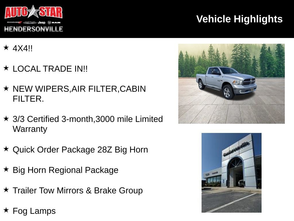 2015 Ram 1500 Big Horn Check out all these great option's Big Horn Regional Package, Quick Order Package 28Z Big Horn (20" x 8" Chrome Clad Aluminum Wheels, 40/20/40 Split Bench Seat, Big Horn Badge, Bright/Bright Billets Grille, Class IV Receiver Hitch, Dual Rear Exhaust w/Bright Tips, Electric Shift-On-Demand Transfer Case, Fog Lamps, Front Armrest w/Three Cupholders, Front Center Seat Cushion Storage, Leather Wrapped Steering Wheel, Premium Cloth 40/20/40 Bench Seat, and Steering Wheel Mounted Audio Controls), Trailer Tow Mirrors & Brake Group (Black Exterior Mirrors, Exterior Mirrors Courtesy Lamps, Exterior Mirrors w/Heating Element, Exterior Mirrors w/Supplemental Signals, Power Black Trailer Tow Mirrors, Trailer Brake Control, and Trailer Tow Mirrors), 17" x 7" Aluminum Wheels, 26 Gallon Fuel Tank, 4-Wheel Disc Brakes, 6 Mo. Trial (Registration Required), 6 Month Trial (Reg. Required), 6 Speakers, 8.4" Touch Screen Display, ABS brakes, Active Grille Shutters, Air Conditioning, Alloy wheels, AM/FM radio, Brake assist, Bumpers: chrome, Center Hub, Charge Only Remote USB Port, Cloth 40/20/40 Bench Seat, Compass, Delay-off headlights, Driver door bin, Dual front impact airbags, Dual front side impact airbags, Electronic Shift, Electronic Stability Control, For Details Go To DriveUconnect.com, Front anti-roll bar, Front Center Armrest w/Storage, Front reading lights, Front wheel independent suspension, Fully automatic headlights, GPS Antenna Input, Harman Radio Manufacturer, Heated door mirrors, Illuminated entry, Integrated Voice Command w/Bluetooth, Low tire pressure warning, Media Hub (SD, USB, AUX), Nav-Capable! See Dealer for Details, Occupant sensing airbag, Outside temperature display, Overhead airbag, Overhead console, Panic alarm, Passenger door bin, Passenger vanity mirror, Power door mirrors, Power steering, Power windows, Radio data system, Radio: Uconnect 5.0 AM/FM/BT, Radio: Uconnect 8.4A AM/FM/SXM/BT, Rear anti-roll bar, Rear step bumper, Remote keyless entry, Remote SD Card Slot, SIRIUSXM Satellite Radio, Speed control, Tachometer, Tilt steering wheel, Tip Start, Traction control, Trip computer, Uconnect Access, Variably intermittent wipers, and VoltmeteR.