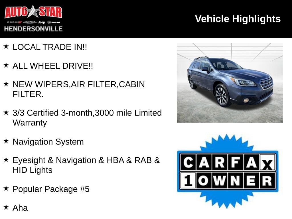 Discover the perfect blend of capability, technology, and style in this exceptional 2017 Subaru Outback 2.5i Limited. With its impressive all-wheel-drive performance, comprehensive safety features, and premium amenities, this Outback is poised to elevate your driving experience.